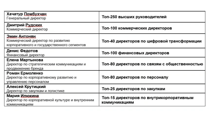 Также в тройку лучших вошли директор по связям с госорганами Владимир Месропян, директор по правовым вопросам Сергей Переверзев, директор по развитию корпоративного бизнеса Наталья Талдыкина, директор по бренду и маркетинговым коммуникациям Татьяна Гура, директор по складской и транспортной логистике Татьяна Гусева, директор ИТ-инфраструктуры Павел Табашников, руководитель проектов по социальным программам Оксана Туранцева и корпоративный секретарь Дарья Лизунова.